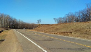 Highway 8 reconstruction underway. The new road will go between the solitary tree in the photo’s center–once at the edge of the forest there–and the new treeline on the right. Gotta move that hill first. Photo Kim Chapman